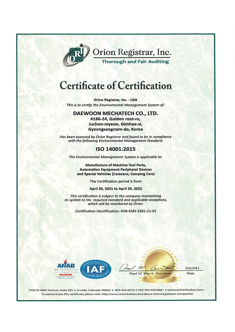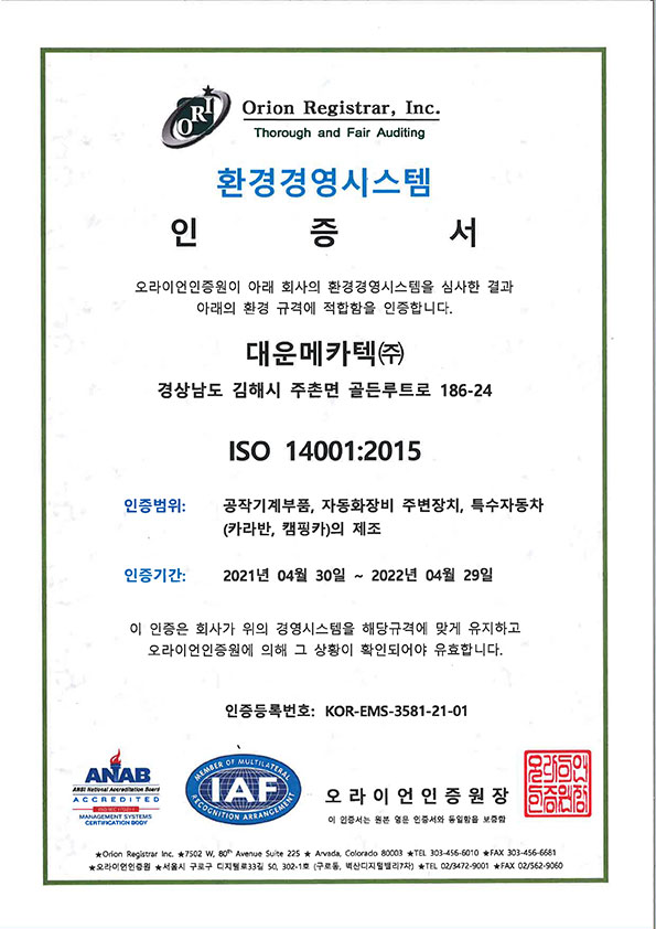 오라이언환경경영시스템인증
